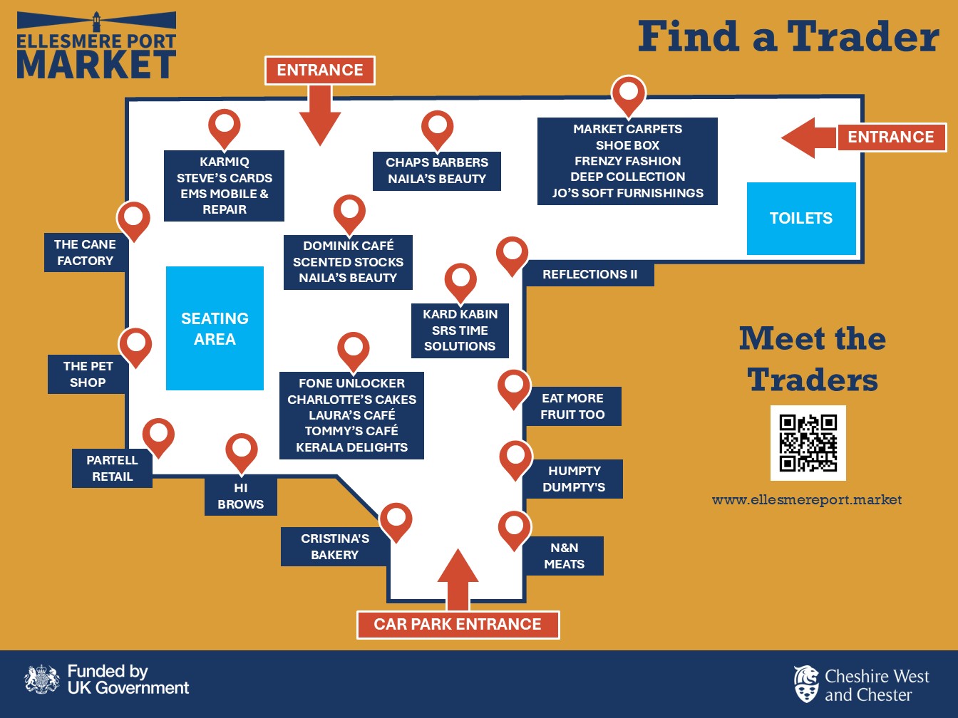 Please bear with us while the works take place, follow the external signs to the nearest entrance and the sign below will be available throughout the market to help you find our traders in their temporary locations.