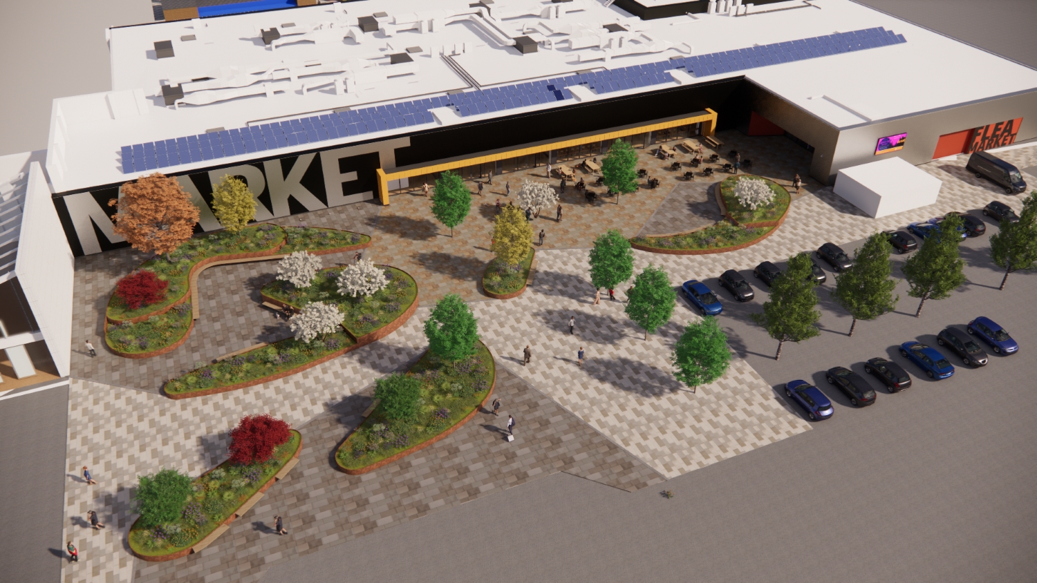 The entrance to the market will be improved with outdoor spaces for seating and events, a separate Flea Market entrance, and secure cycle parking.
